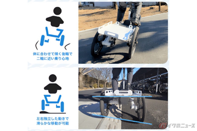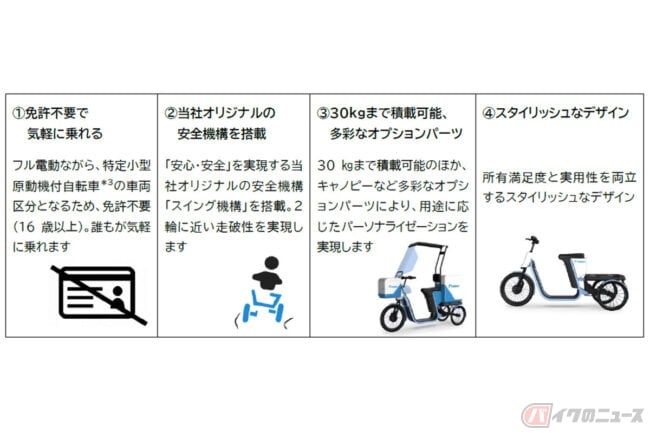 スタイリッシュな外観、リアにオリジナルの安全機構「スイング機構」を搭載することで3輪でありながら2輪に近い感覚と高い安心感を持たせると共に、30kgまで積載可能バッグやキャノピーなどのオプションパーツなどにより使い手の用途にあわせたカスタムも可能となっています。