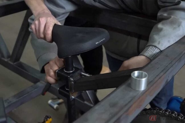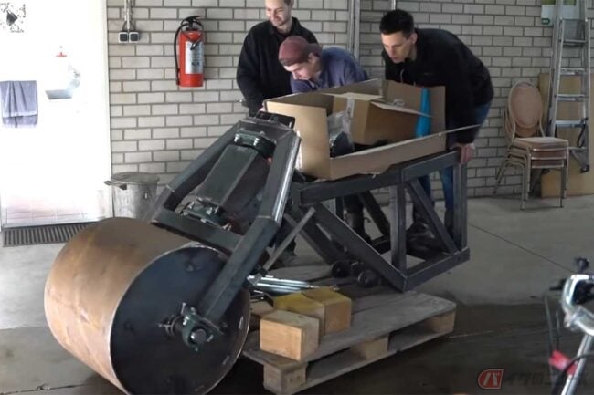 すべての作業が数人がかりで、なるほど確かに工学の知識がなければ不可能なレベルの複雑さ。使用するボルトの数も山盛りで、戦車をDIYしているのでは? と錯覚してしまうほど。しかし、唐突に見慣れた形のサドルが登場するあたりから、脳が「これは自転車だ」と認識し始めます。
