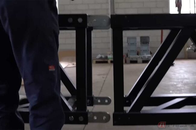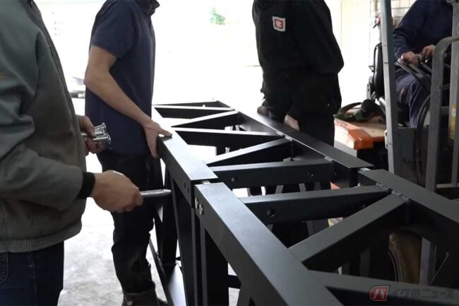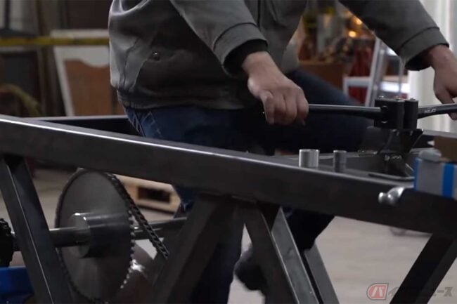 まず映し出されるのは、まるでドラム缶のような極太の車輪。さらに自転車とは思えない鉄骨フレームを溶接していくのですが、もはや自転車どころかクルマやバイクを超えて、機関車か橋の一部を作っているかのような、重厚なパーツばかりが登場します。