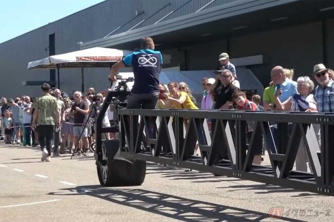 いざ屋外で試乗という段階になっても、やはり鉄橋の一部のように見えてしまう異形ぶり。それでもゆっくりと動き出す様子を目にすると、計5人乗りながら、しっかりと「2輪」で走っていることに驚かされます。