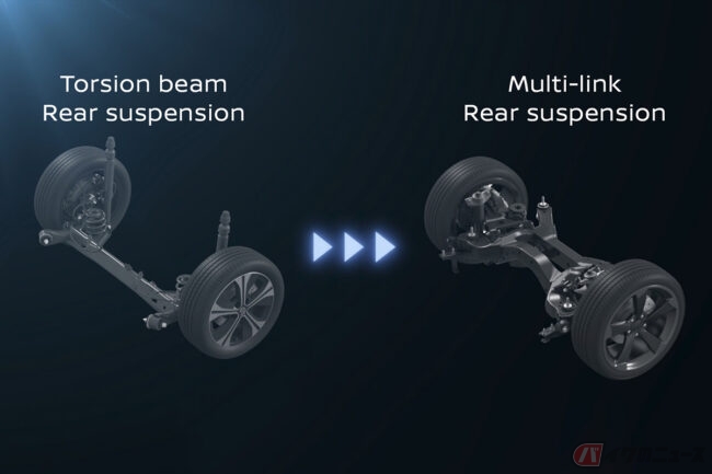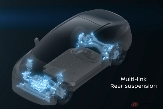 それらに加え、新型リーフにはリアにマルチリンクサスペンションを採用。これにより車体の横剛性が66%向上し、CMF-EVプラットフォームと高剛性ボディ構造と相まって、俊敏性と乗り心地が大幅に改善されています。