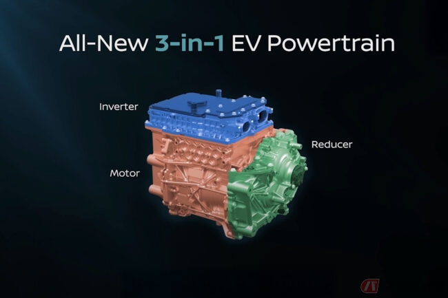 新型リーフは、新型の電動パワートレイン「3-in-1」を初めて採用。従来3つに分割されていた主要なコンポーネントをパッケージ化することで、現行モデルより10%小型化し、最大出力は160kW(214hp)で最大トルクは355Nm(261lb-ft)です。