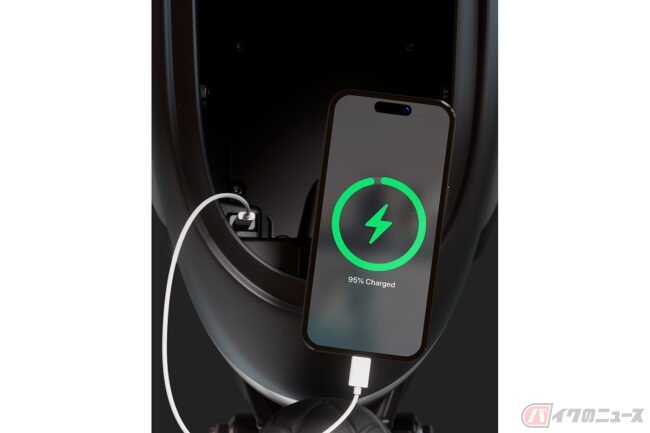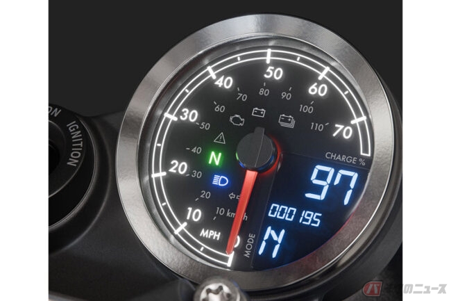 10リットルのガソリンタンク風ストレージにはガジェット充電用のUSB-Cポートも装備され、アナログスピードメーターとデジタルディスプレイで走行情報が表示されます。
