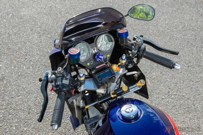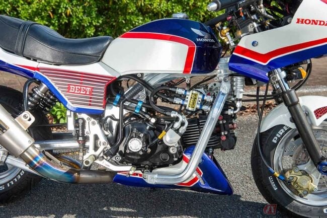 そのほか、パステルロード製のサイドカバー/テールエンドをオーナーが自身でカスタムパーツメーカー「ビート」の製品風にアップデートし、1型のトリコロールカラーに塗装までするという、単なる再現ではなくCBX乗り・CBX好きが唸ってしまうポイントも押さえたカスタムに仕上げられています。