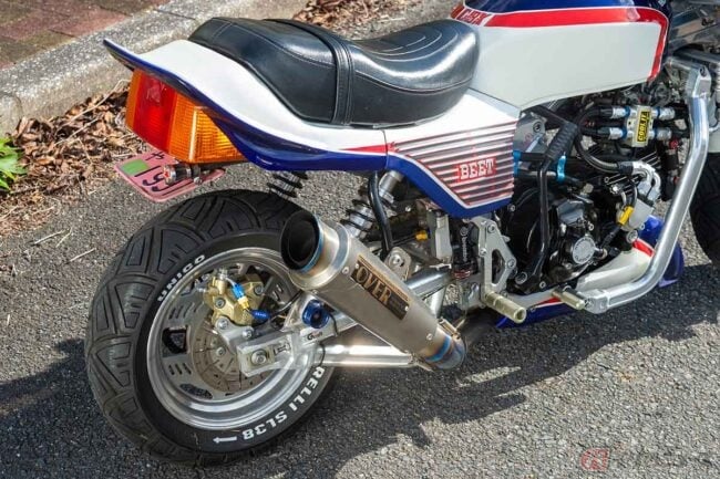 まず足回りを見れば、ブーメランコムスター風のアルミ削り出しホイールにインボードブレーキ風のカットが施されたディスクローターなど、そこだけ見てもCBX400Fをご存じの方なら再現度の高さに驚くでしょう。