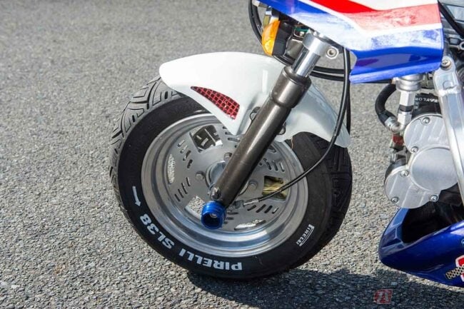 また見た目だけでなくパワートレインも当然ながらフルチューン仕様となっており、シリンダーヘッドはDOHC・4バルブを可能にするキタコ製で、排気量は110ccにアップ。