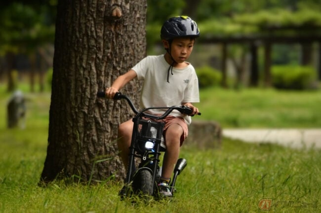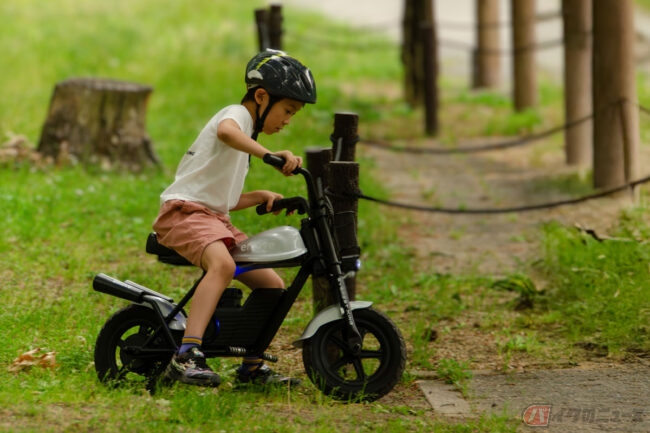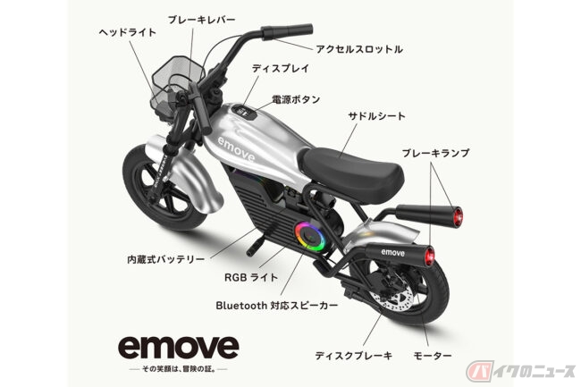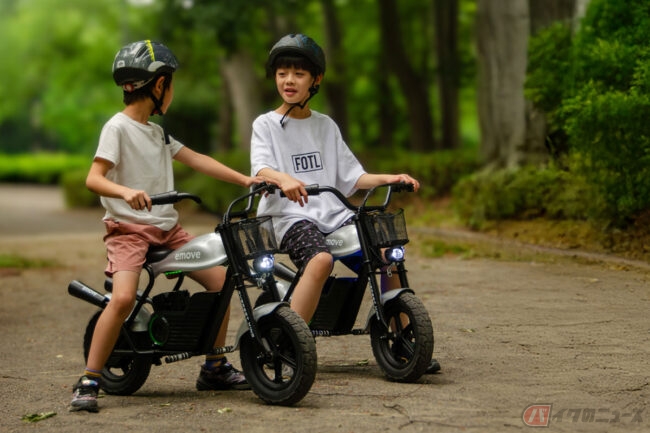 「日常にちょっとした冒険を」をテーマに、子供から大人までワクワクする新しいモビリティ体験を提供するために開発されたemoveは、スロットルを回して進むフル電動バイクで、耐荷重80kgの本格設計のため子供だけではなく大人も楽しむことが可能。