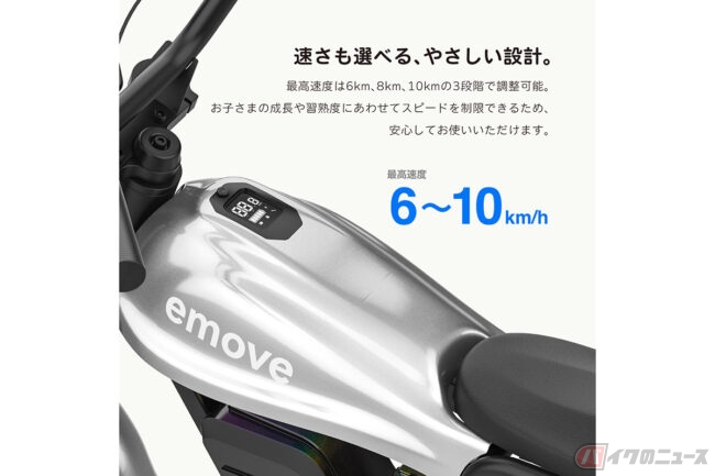 最高速度は6km、8km、10kmの3段階で、使用者の年齢に合わせたスピードに設定することで安全に走行を楽しむことができます。
