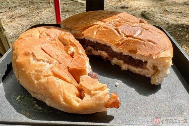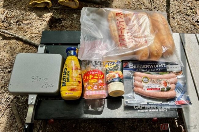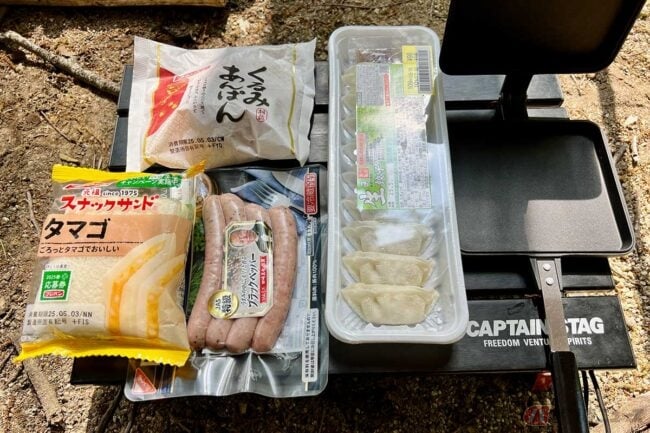 キャンプ場に到着する手前のスーパーで、あんぱん、餃子、ホットドッグ用のソーセージ、スナックサンド(タマゴ)などを購入。ひとつずつ焼いてみます。
