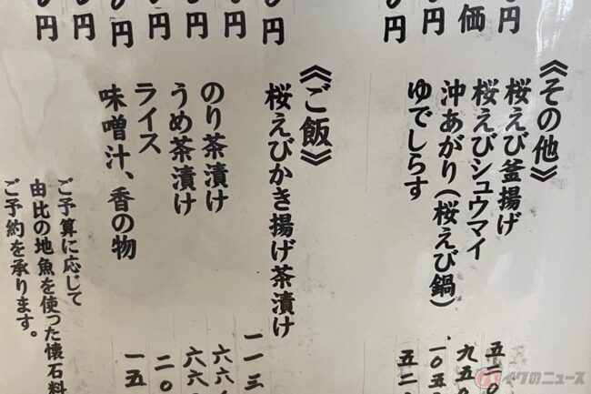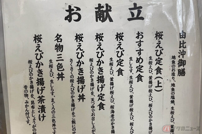ただ、桜えびシーズン中(春漁は3月中旬~6月初旬、秋漁は10月下旬~12月下旬)の由比は多くの人が訪れて人気店は激混み確実。休日に行ったりしたら大変です。そこで、バイクのニュースを読んでいただいている読者の皆さんのために、由比に通い続けた筆者、ゴトーがとっておきの穴場店をご紹介することにしましょう。それが「玉鉾(たまほこ)」です。