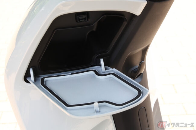 CUV e:は二人乗りも可能なタンデムシートが付いていて、キャリアも標準装備。こういった先進的なデザインの車両には、オプションでキャリアを後付けできる仕様になっていることが多いけど、CUV e:のシート下は収納ではなく着脱式のバッテリー「Honda Mobile Power Pack e:」が積んであるので、代わりにキャリアが最初から付いているみたいだね。
