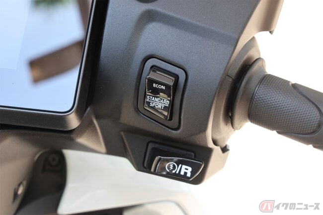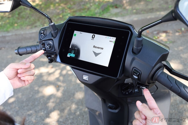 CUV e:には電動バイクならではの、リバースモード機能がついているんだ。右のスイッチボックスのリバースボタンと左のスイッチボックスのボタンを同時に押すことで、操作が可能だよ。