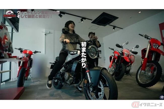 お笑いコンビ「スピードワゴン」の井戸田潤さんのYouTubeチャンネルで、女性スタッフ・ノザワさんがバイクデビュー。ハスクバーナ「ヴィットピレン401」に一目惚れして免許取得から自費購入、納車、そして公道デビュー。緊張から笑顔へ変わる成長ストーリーが640万回再生の人気企画となっています。