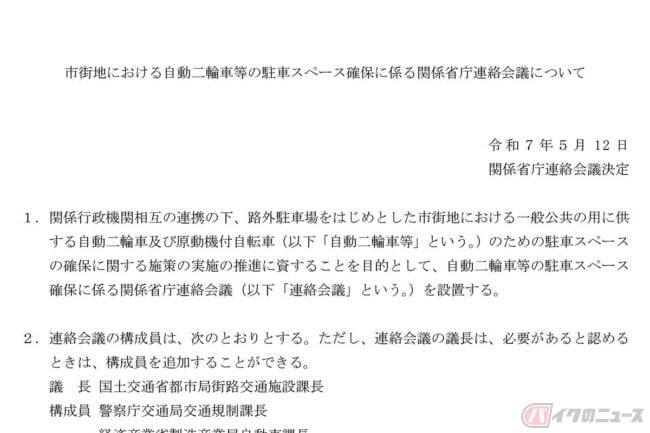 2025年5月12日、国土交通省都市局が主催するバイク駐車場整備のための会合がひっそりと開かれました。その名称は「市街地における自動二輪車等の駐車スペース確保に係る関係省庁連絡会議」です。開催日すら知らされず、後に国交省ウェブサイトに掲載されたことで、そのことが初めて国民に公開されました。