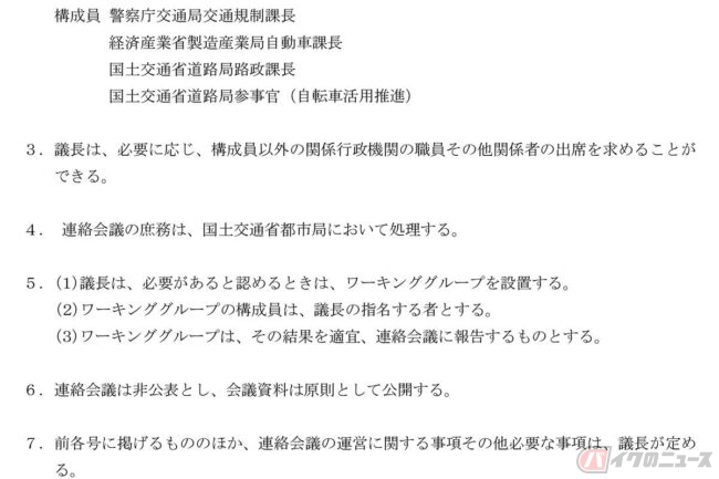 そこに、警察庁交通局交通規制課、経済産業省自動車課、さらに、国土交通省道路局から道路上の駐車政策について担当する路政課と、自転車駐輪場に駐車することなどを考慮し、自転車活用を推進する道路局参事官が加わりました。課長級の連絡会議です。