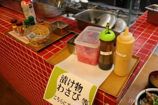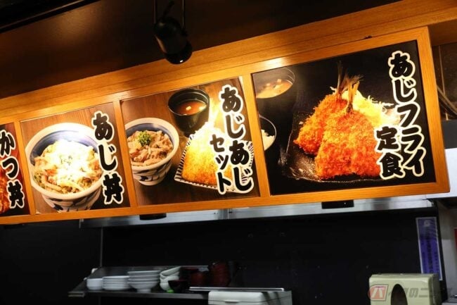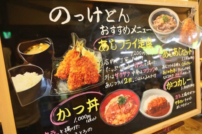 暑いから冷たい蕎麦か、「ぶたたま丼」や「とんちゃん焼き定食」も捨てがたい……などと見ていると、「のっけどん」のメニューのトップに「あじフライ定食」があることに気づきました。しかも別のボードにおすすめメニューとして「あじフライ定食」と「あじあじセット」なるものが手書きで描かれています。こうなると食べないわけにはいきません!