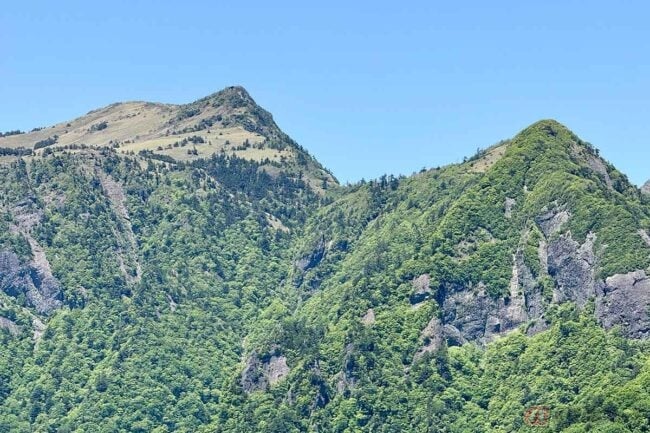 青空の下に笹原が広がり、その背後には岩がむき出しの険しい峰々があり、西日本最高標高を誇る山岳風景を目にすると、ここまでの長丁場の疲れがどこかに吹き飛んでしまいます。