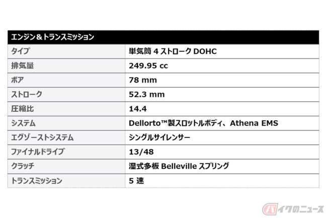 トルク容量を大幅に拡大し耐久性を向上させた新しい高性能Exedy製クラッチの採用、ブレンボ製油圧システムを採用した5速ギアボックスによるスムーズで正確な変速、クラッチレスで2速から5速へのシフトアップが可能なクイックシフター、サスペンションセッティングのアップデートを施すことで、ミッドストロークコントロール、シャシーバランス、コーナリング安定性が向上しています。