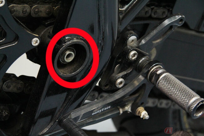 車種によりますが、スイングアームは常に動くため、ピボットシャフト、及びスイングアーム側のピボット部両端に備えられたベアリング、ブッシュは走行中、常に摺動し激しい摩擦にさらされています。そのためグリスアップは欠かせないのですが、意外と忘れがちなメンテナンスポイントといえるでしょう。