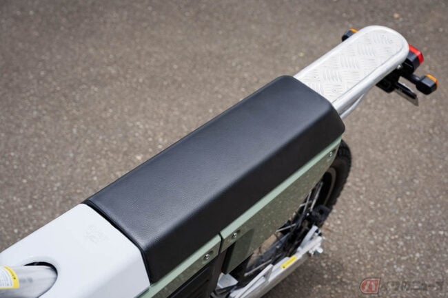それでは、恒例の足つきチェックでございます!私(=身長160cm)が跨ってみると、シート高は790mmなので両足とも膝を曲げてゆとりを持って地面に着くことができました。また、電動バイクというよりもまるで電動アシスト自転車に乗っているような軽さと安心感がありました。車体重量は58kgで、軽さも魅力! 押し歩きもラクラクで、自転車置き場にちょこんと停まっていても違和感ないかも(笑)。