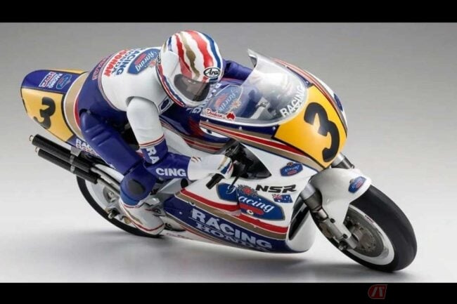 またラジコンで有名な「京商」は、1992年にRCバイクの「ハングオンレーサー」を発売。乗車するライダーのフィギュアは関節が13カ所もあり、車体を傾けると連動してヒョイッと腰をズラしながらイン側のヒザを開きます。