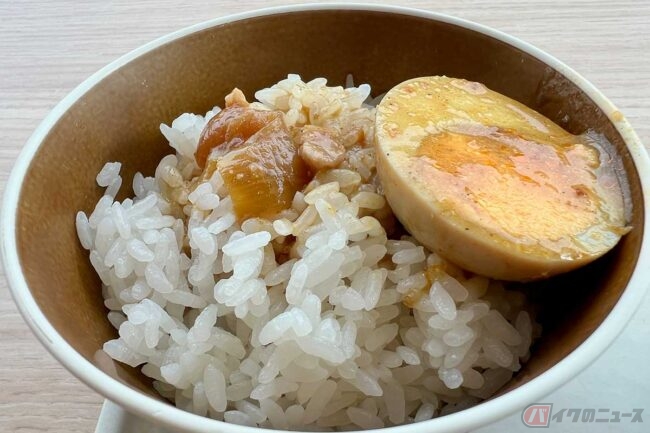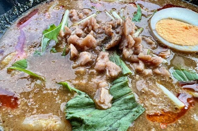 モンゴルか東南アジアか、どこか異国情緒を感じさせるような風合いです。具材はゆで玉子や肉、トロトロに煮込まれた玉ねぎも入っていて、水菜が散りばめられています。