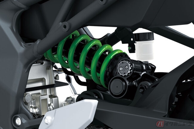 また、上位グレードとなるNinja ZX-25RRでは、専用のロゴ入りグラフィックに加え、SEモデルの装備(USB電源ソケット、ウインドシールド(スモーク)、フレームスライダーを除く)、そしてショーワ製BFRC-liteリヤショックアブソーバーを標準装備。