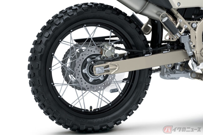 昨年、登場したKLX230 SHERPAがシート高845mmであるのに対して、シート高を825mm とすることで足つき性を向上させたほか、リアにチューブレスタイヤを装備することで、パンク修理やタイヤ交換時の利便性が高められています。