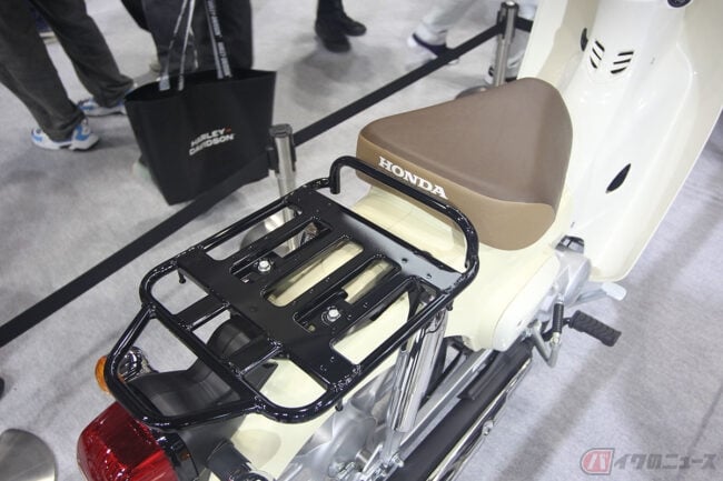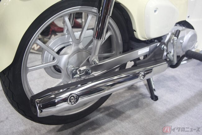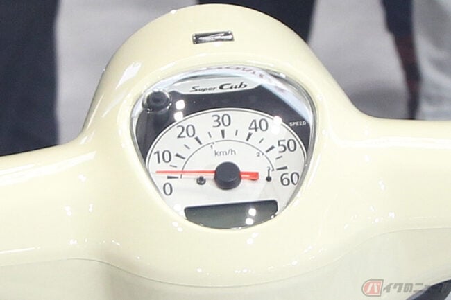 そして、展示車両には安全装備として前輪にABSを搭載し、ホイールは「スーパーカブ50」のスポークタイプからスーパーカブ110と同じくキャストタイプに、フロントブレーキもドラムからディスクに置き換えられ、メーターの表示は60km/hが最高値とされています。