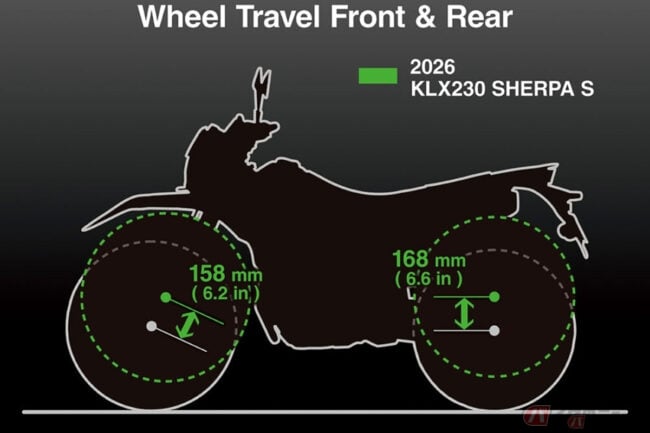 全長2100mm×全幅835mm×全高1165mmのボディサイズと、1380mmのホイールベース、車重136kgとされたKLX230 SHELPA Sは、シート高を845mmから825mmに変更することで、足つき性を向上させています。