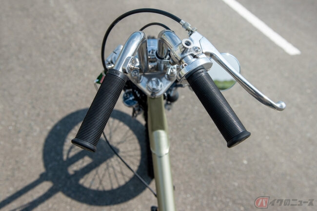 まず、このカブチョッパーの決め手となるフロントエンドは、幅の狭いトップブリッジとテレスコピック式のフォークを採用するホンダのトレッキングバイク「TL125」用を流用し、フォークジョイントでインナーチューブをさらに延長。