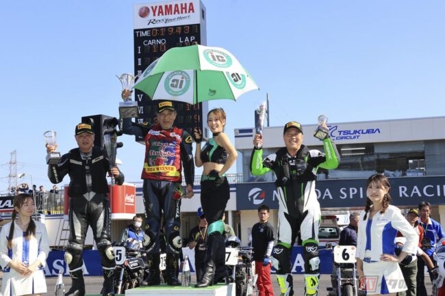 2ストロークマガジンを出していた時は、ホンダ「NSR250R」で石川勝則選手がZero4クラスに参戦。BEL-RAYのオイルを使用したノーマルエンジンで見事3位表彰台を獲得しています。このときは練習やレースで全開走行を続けましたがピストンとシリンダーのアタリも良好で摩耗が少なく、もちろんトラブルは発生しませんでした。高年式のレプリカでも好結果でした。