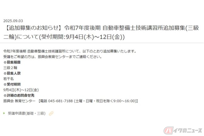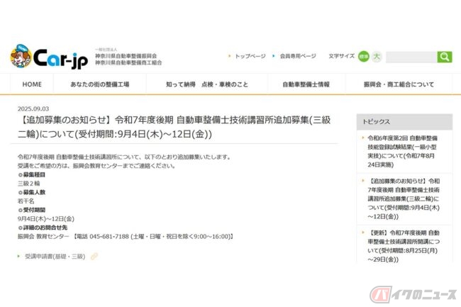 枯渇!? バイク整備士資格者 神奈川県整備振興会が異例の追加募集 東京は定員「増」