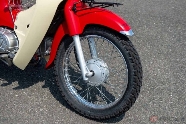 ここまでで、“旅”に必要なものだけをシンプルにまとめていますが、極めつけはトライアルタイヤ。やはり旅先の路面状況はわからないことが多いのでロードタイヤではなく、こういったトライアルやセミオフロードタイプのタイヤを装着することで、昨今の悪天候にも対応できるうえに、キャンプ地などでの使用も念頭に踏まえたオーナーの選択は流石の一言です。