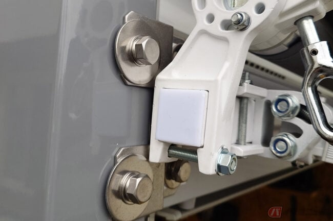 この金具を利用して、テントユニット本体の取り付け金具を柱でも固定できるようにしました。また同時に、テントユニットをガレージ壁面寄りへ追い込むことができ、ガレージ本体の天井軒部分(出っ張り部分)とオーニングテントの隙間を減らすことができました。さらにオーバーハングが減ったことで、ガレージ本体への重量的負担が減りました。