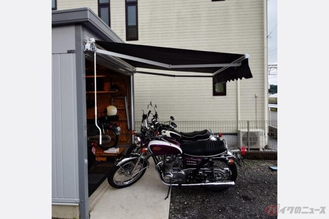 「クルクルっと巻き上げて格納できる」オーニングテントが「ガレージライフ」を変える!! バイク整備から雨避けまで多用途に活躍 たぐちかつみ・マイガレージ回顧録