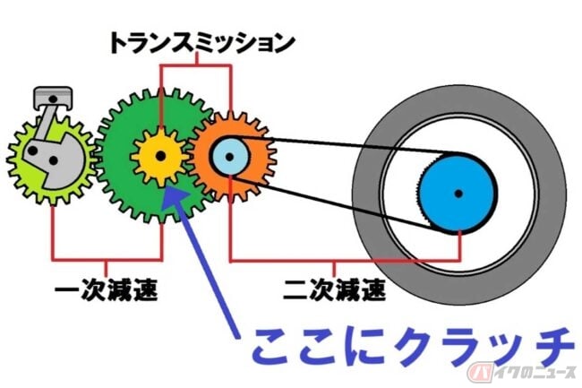 バイクのエンジンは、始動したらメインキーやキルスイッチをオフにするまで回りっぱなしです(アイドリングストップ機構は除く)。もしエンジンのクランクシャフトからトランスミッション(変速機)を介してリアタイヤまで、すべてがギアやチェーンで繋がっていたら、エンジンを止めないと停車することができません。