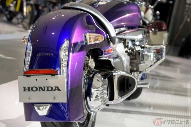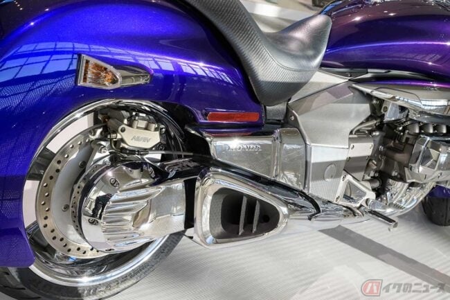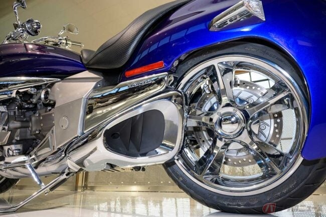 シャフトドライブを内蔵する片持ちのプロアーム(従来型の「GL1500」は左右持ち)は、MotoGPマシンにも使用されたユニットプロリンクを採用しています。ユニットプロリンクはリアショックの上部支点もスイングアームに固定されるため、フレーム側にクロスメンバーが不要で、フレームを開いたり下げたりと、設計の自由度が増えます。
