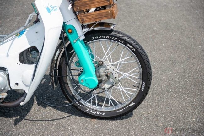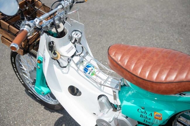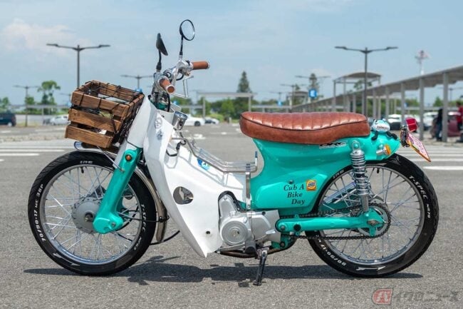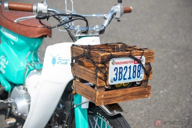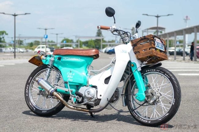 発色の良いミントグリーンに木製バスケットが印象的な、どこかアメリカ西海岸のビーチクルーザーのような装いすら感じさせるホンダ「スーパーカブ」カスタム。