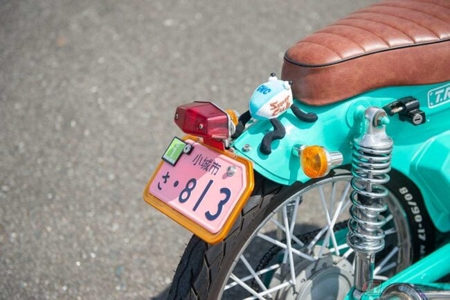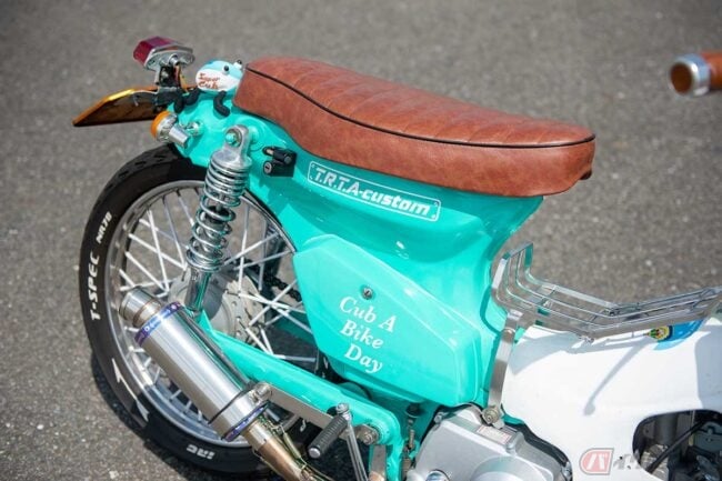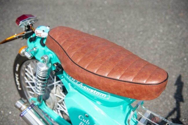 リアフェンダーの形状を見たところ、恐らくカブ“カスタム”(ヘッドライトが角目のモデル)がベースですが、同モデルは他の“鉄カブ”と異なり、リアフェンダーを切断せずとも樹脂製のリアフェンダーユニットを取り外すと純正でショートフェンダー仕様になっているため、住宅事情や切断機器が苦手な方にはスーパーカブの中でもおすすめのベース車両といえます。