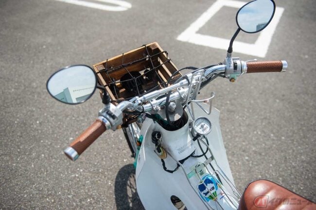 そしてカブカスタムの定番といえるバーハンドル化ですが、同カスタムでは市販のプレートにセミアップハンドル、ブレースバー、ドリンクホルダーを装着。そこにオーナーお手製の木製バスケットがプラスされることで、質素になりがちなコックピットにボリュームを持たせています。