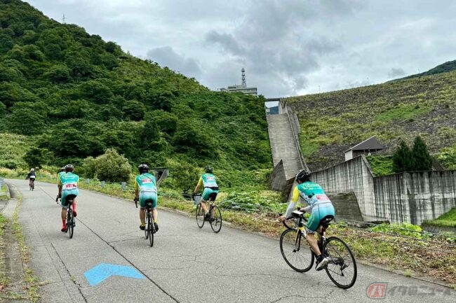 名物区間のひとつが「三国川ダム」です。翌日のJ Pro Tour南魚沼ロードレースの舞台となるコースです。距離1.5km、平均勾配8.5%で、後半にかけて斜度が増し、脚を容赦なく削っていきます。