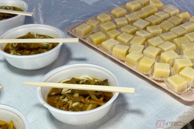走り出してわずか20km、第1エイドで待っていたのは「カレーうどん」です。米粉を使った麺にきのこがたっぷり入っており、南魚沼の山の幸を感じられます。さらに「バター餅」がデザートとして登場。もちもちの食感にバターの香りが広がり、つい笑顔になりました。序盤から満腹感に包まれつつ、ここからはいよいよ脚力が試されます。
