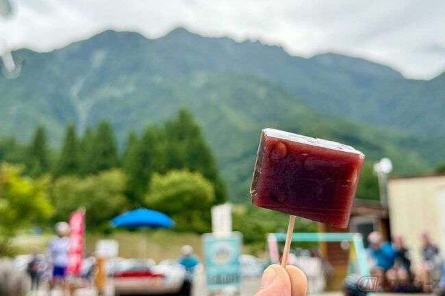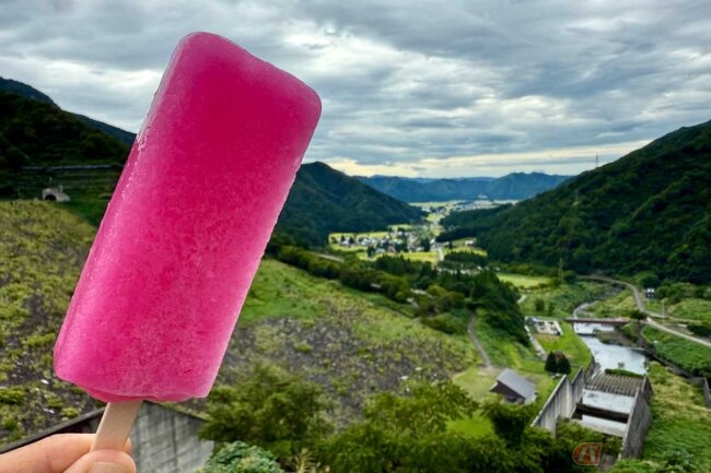 必死にペダルを踏み込み、激坂を登り切った先で出迎えてくれたのは新潟名物「桃太郎アイス」です。いちごシロップ味のかき氷を固めたようなシャリシャリ食感が、火照った体を癒してくれます。ダム湖越しに広がる田園を眺めながら味わうアイスは格別でした。