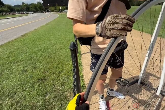 そもそもこんな巨大なリムが販売されているのかどうかは不明ですが、さすがにタイヤは市販品ではないとのこと。大規模なレースが行われているというのも納得の、まるでロードバイクのようなタイトなリムです。