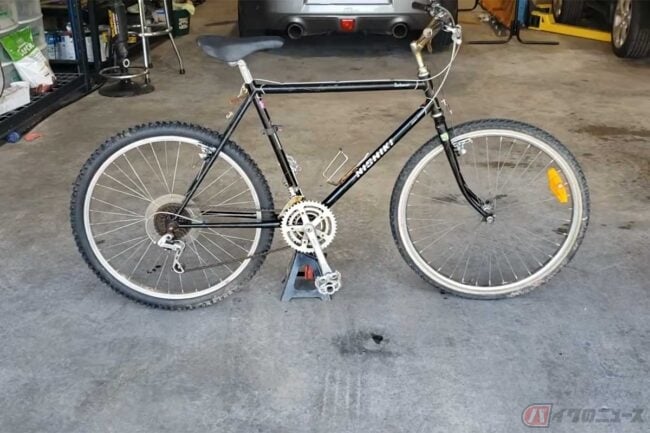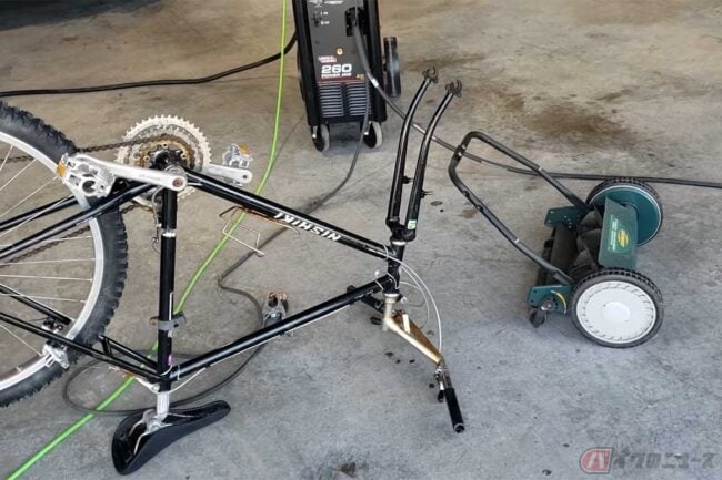 その工程は、まず動画主がホリゾンタルフレームの、おそらく1990年代のニシキのMTBを用意します。これはゴミ箱で拾ったものだそうですが、その前輪部分を小型の手押し芝刈り機にトランスフォームしようということのようです。