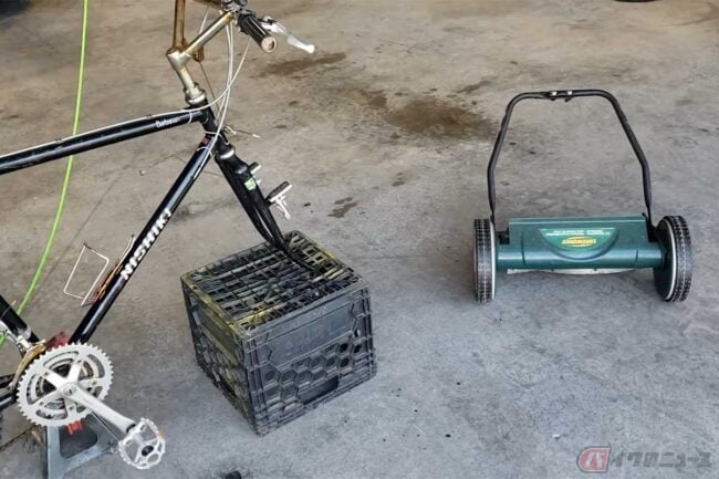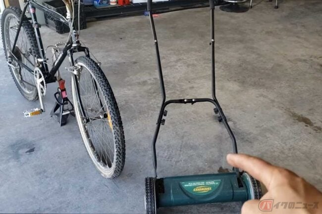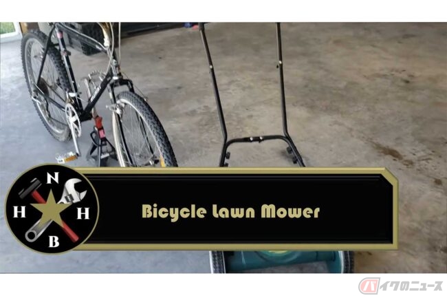 日本ではなかなか馴染みがありませんが、欧米では庭付き平屋一戸建てに住む家主が、芝刈り機を使って広い庭の手入れをする光景が一般的です。それをどうにかラクにできないかと考え、DIYで自転車の前輪を芝刈り機にしてしまえ、というアイデア動画に注目します。