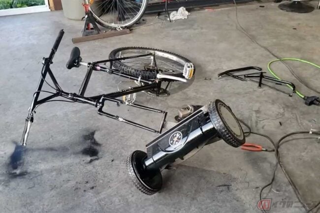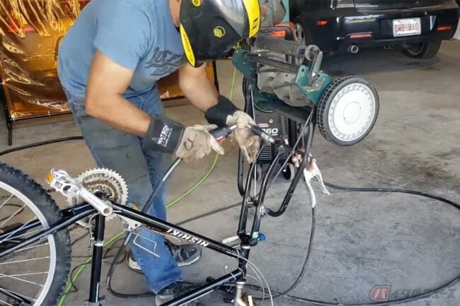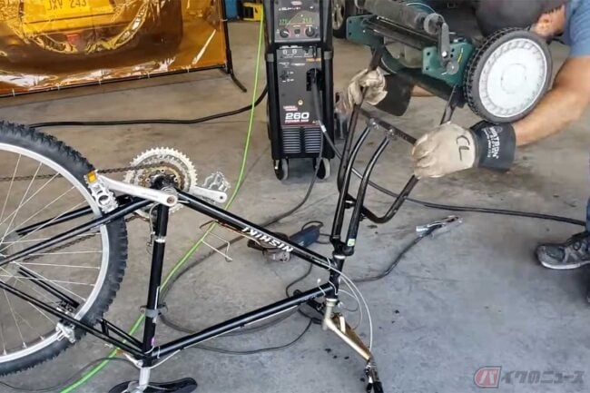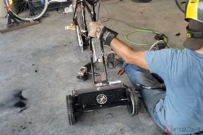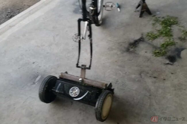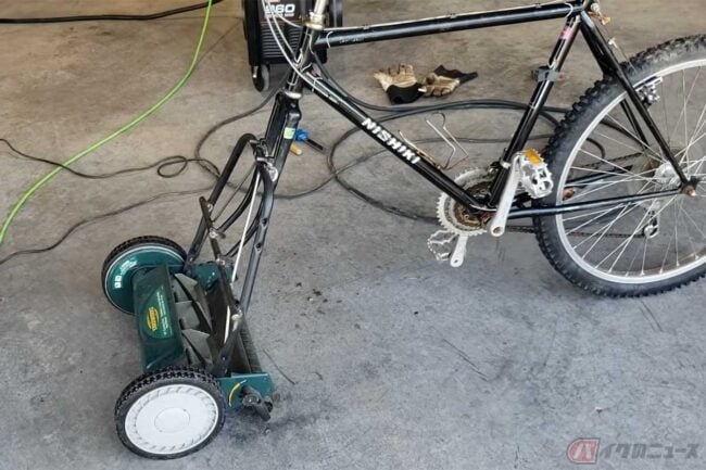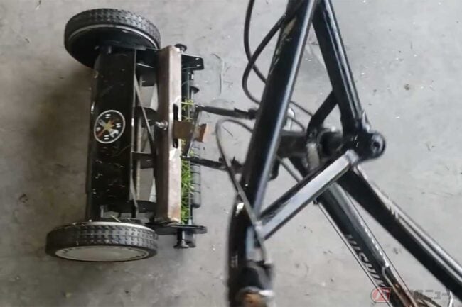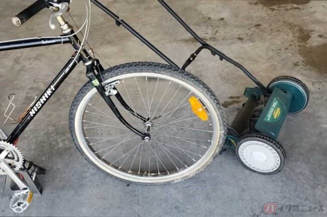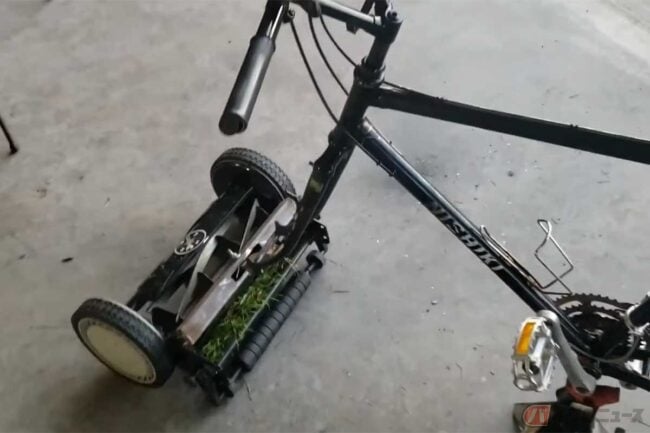 それじゃ曲がれないぢゃん……自転車の前輪部分を「芝刈り機」にDIYトランスフォーム!! ちょっと呆れる動画に視聴者から反響