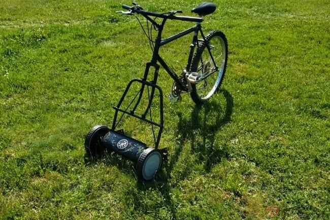 欧米の映画やドラマで、庭付き平屋に別棟でガレージという広い敷地で、庭の芝刈りをするシーンは定番です。しかし実際の広い庭の芝刈りは、なかなかの重労働でしょう。そこで、自転車の前輪を芝刈り機にしてしまおうというアイデアを思いつき、レトロなマウンテンバイクをベースにDIYした動画がじつにシンプル、というか安直で、思わず呆れてしまうレベルなのです。