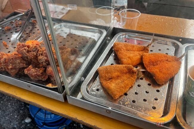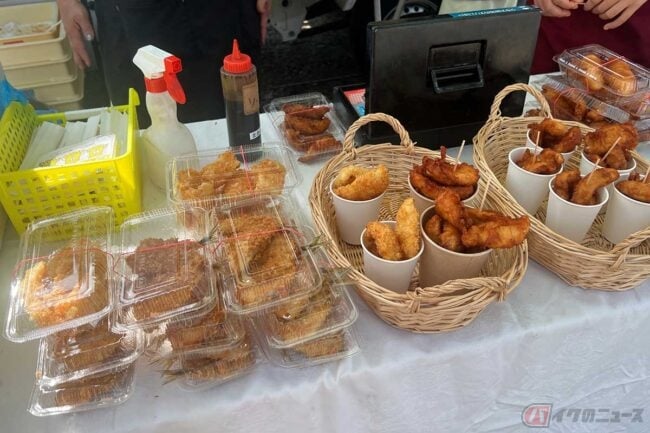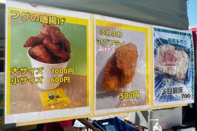 ほかにも「フグの唐揚げ」に「さざえめし」、「たこめし」と地元の食材を使った料理が食べられます。今回は「アジフライ」に「フグの唐揚げ」「金目鯛飯」をいただきました。イベントで食べられるアジフライとは思えないほどサクサクのふわふわ食感です。「金目鯛飯」はご飯に味が染みていて美味しい! 横須賀市を中心に各地のイベントに出展しているそうです。